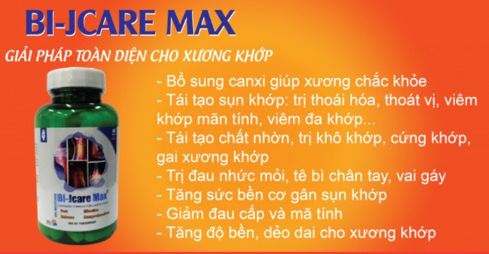 Bi-Jcare Max là viên uống bổ sung dinh dưỡng thiết yếu quan trọng nhất cho xương khớp giúp xương khớp chắc khỏe, hỗ trợ điều trị hiệu bệnh lý về xương khớp an toàn hiệu quả. Được nghiên cứu bới các nhà chuyên môn dược lý uy tín của Mỹ và sản xuất trên dây chuyền côn nghệ tân tiến hiện đại nhất hiện nay. Bi-Jcare Max được đích thân B.sĩ Th.sĩ Phan Đăng Bình khuyên dùng và lựa chọn đưa về Việt Nam.