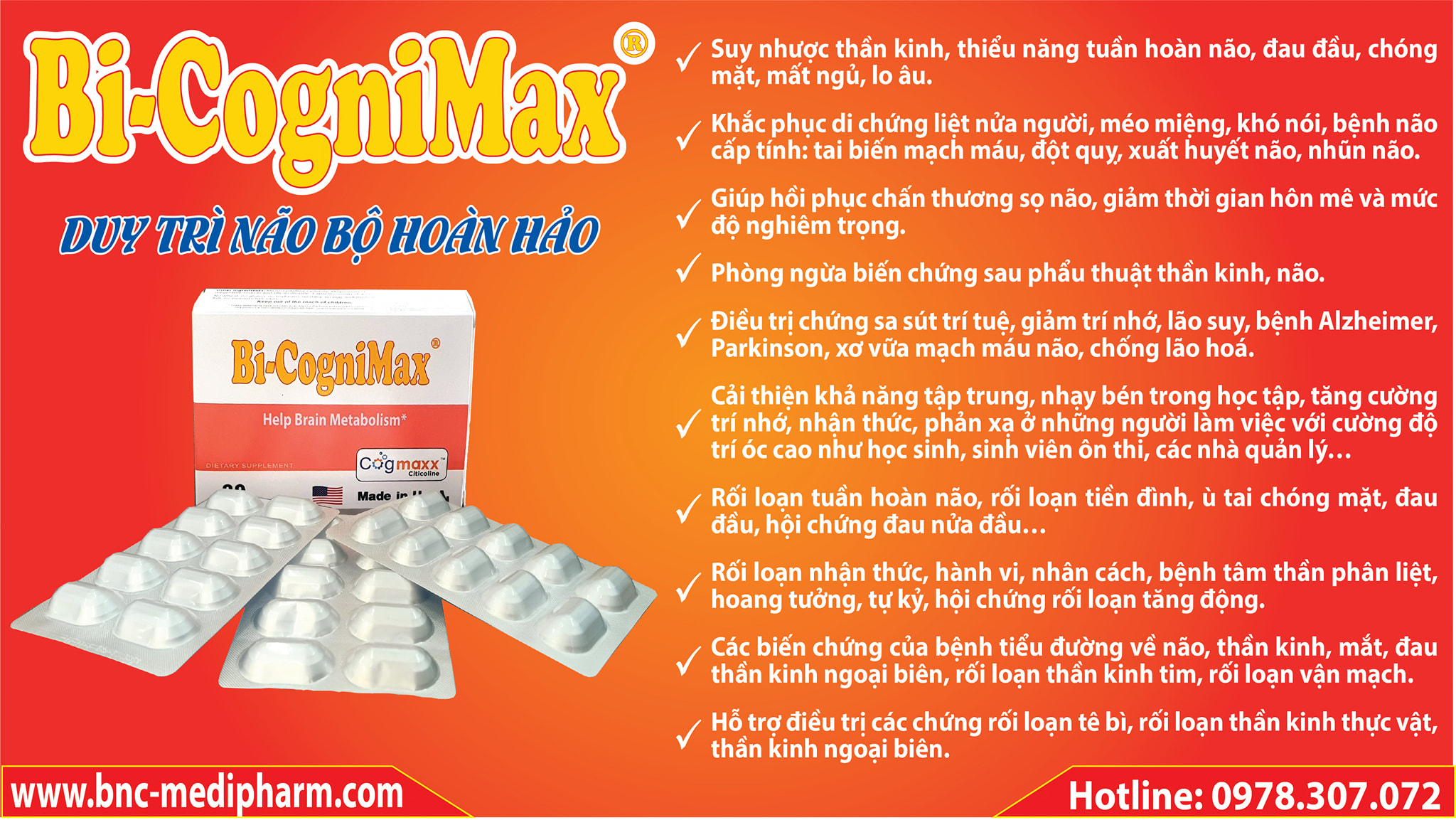 - Bi-Cognimax là một sản phẩm chuyên biệt cho não được đăng ký bản quyền thương hiệu giữa các nhà khoa học của Hãng Vesta Pharmaceuticals, Inc, U.S.A và nhà phân phối BNC Medipharm để hỗ trợ điều trị chuyên biệt về các bệnh lý não, trong đó hoạt chất chính là Citicoline với biệt dược thương mại nổi tiếng đã được đăng ký độc quyền trên thế giới là Cognizin, hiệu quả điều trị đã được chứng minh lâm sàng cải thiện chức năng não và các bệnh lý về não.