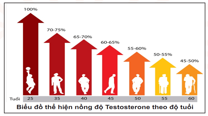 1. Vai trò testosterone: là hormone quyết định đặc điểm sinh dục của nam giới được sản xuất bởi tế bào Leydig của tinh hoàn (95%) và tuyến thượng thận (5%), điều hoà bởi các hormone hướng dục thuỳ trước tuyến yên và dưới tác động của hệ thống điều khiển ngược âm tính lên trục dưới đồi - tuyến yên – tinh hoàn. Mỗi ngày tinh hoàn sản xuất khoảng 5-7mg testosterone và mỗi tinh hoàn chứa khoảng 50mg testosterone và được phóng thích thường xuyên vào dòng máu. Vào máu testosterone gắn ngay với albumine và globuline (SHBG) của huyết tương, chỉ có 2% ở dạng tự do. SHGB là Sex Hormone Binding Globuline, đây là loại testosterone xấu- hàm lượng càng cao càng nguy hiểm cho cơ thể. Testosterone tự do và testosterone gắn với albumin được coi là có tác dụng sinh học. Xác định được testosterone sinh học có tầm quan trọng trong việc chẩn đoán và điều trị thiểu năng một phần androgen của người lớn tuổi. Tuổi tác liên quan đến sự suy giảm nồng độ testosterone toàn phần, tăng nồng độ SHBG và giảm testosterone tự do trong huyết tương. Ở một nghiên cứu cắt ngang với hơn 3.000 nam giới tuổi từ 40 đến 79 tham gia cho thấy nồng độ testosterone huyết thanh giảm trung bình 0.4%/năm tuổi, trong khi nồng độ testosterone tự do giảm 1.3%./năm tuổi. Trong một nghiên cứu khác, có 890 nam giới tham gia, testosterone toàn phần <305ng/dL (mức chỉ số đánh giá thiếu hụt androgen) là 20%, 30% và 50% tương ứng với lứa tuổi 60, 70 và 80. Testosterone tự do là dạng có hoạt tinh sinh học của hoocmon. Khi tuổi đời càng cao, nồng độ SHBG càng tăng, testosterone bị gắn chặt với globuline nhiều lên và làm cho hàm lượng testosterone dạng tự do trong huyết tương càng ít đi nên tác dụng của testosterone trên các mô đích giảm rõ rệt dẫn đến hiện tượng mãn dục và lão hoá ở nam giới.
