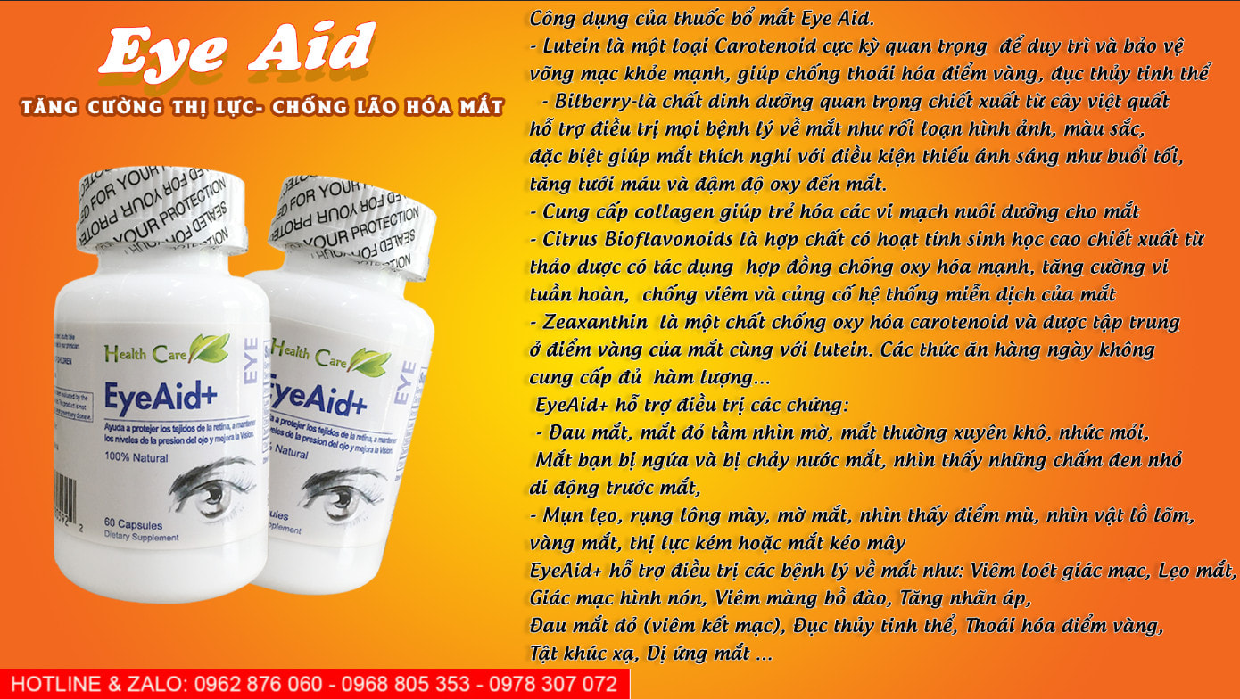 EyeAid+ là sản phẩm đặc biệt của hãng Health Care chuyên bổ dưỡng cho đôi mắt của ban. Đây là sản phẩm 100% các thành phần được chiết suất từ thảo dược quý bổ dưởng cho mắt. Sản phẩm này bao gồm các thành phần Lutein, Biberry, Citrus, Bioflavonoids và Zeaxanthin Lsomers là những thảo dược quý hiếm bổ dưỡng cho mắt.