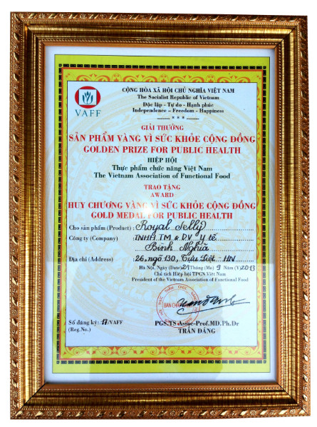 Va Sản phẩm Sữa Ong Chúa Royal Jelly 1400 đã vinh dự nhận được cúp vàng do hiệp hội thực phẩm trao tặng sản phẩm vàng vì sức khỏe cộng đồng của hiệp hội thực phẩm chức năng Việt Nam trao tặng.
